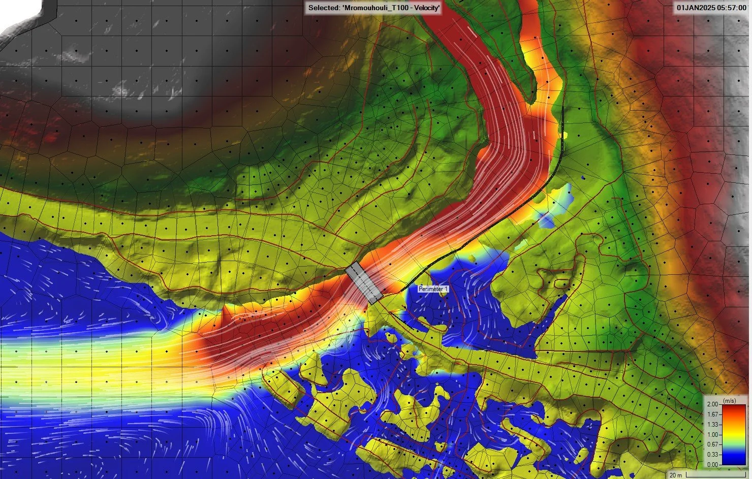 Nos études permettent de déterminer les zones inondables, d’analyser les vitesses et les hauteurs d’écoulement, et de concevoir des systèmes de drainage ainsi que des mesures d’atténuation adaptées au risque réel du site